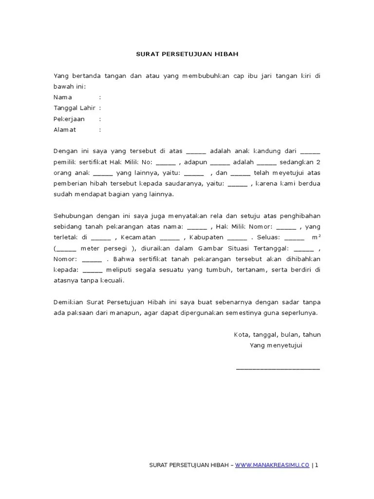 Hibah dalam kuh perdata diartikan sebagai suatu persetujuan, dengan mana. Surat hibah tanah adalah dokumen legal berupa surat persetujuan dari anak kandung maupun ahli waris pemberi hibah. (3) contoh format keputusan hibah sebagaimana dimaksud. Rekening hibah yang ditujukan kepada kuasa . Draft surat permohonan persetujuan pembukaar.